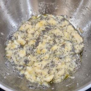 - Trộn nguyên liệu ướt: Nghiền nhuyễn chuối chín trong tô lớn. Cho hỗn hợp hạt chia, dầu oliu vào trộn đều.