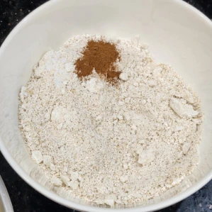 - Trộn nguyên liệu khô: Cho bột yến mạch, bột nở, muối, bột quế vào tô. Trộn đều đến khi hỗn hợp hòa quyện.