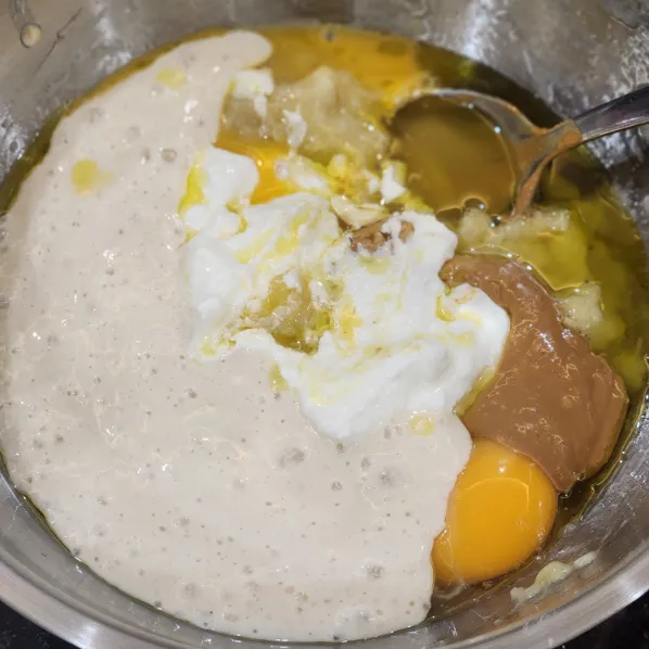 - Nghiền nhuyễn chuối. Sau đó thêm vào: lòng đỏ trứng, sourdough starter, sữa chua Hy Lạp, dầu olive, bơ hạt điều→ Trộn đến khi hỗn hợp mịn và đồng nhất