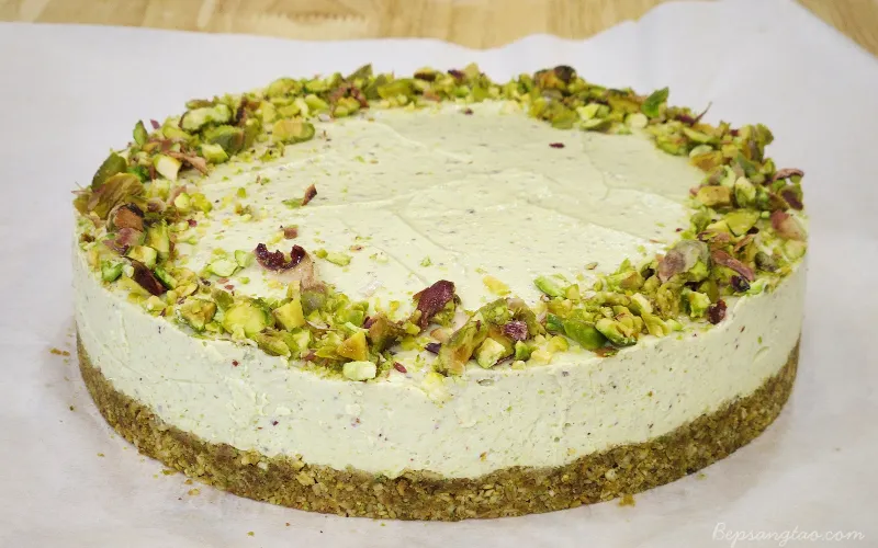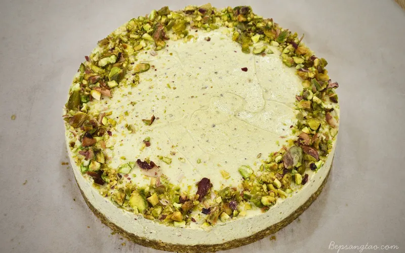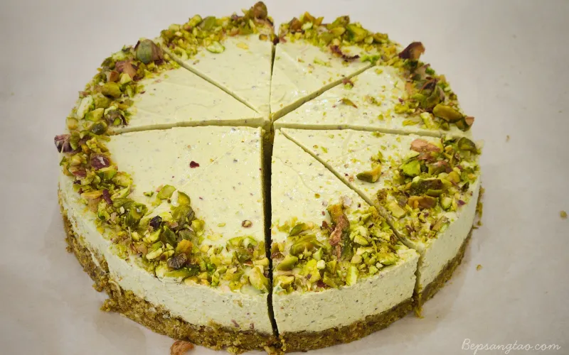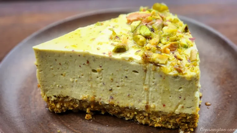 Pistachio Yogurt Cheesecake là phiên bản bánh lạnh lành mạnh, kết hợp giữa sữa chua Hy Lạp và bơ hạt dẻ cười tự nhiên. Không sử dụng kem tươi, không quá ngọt, chiếc bánh mang lại cảm giác nhẹ nhàng, thanh mát nhưng vẫn đủ độ béo mịn và tròn vị.