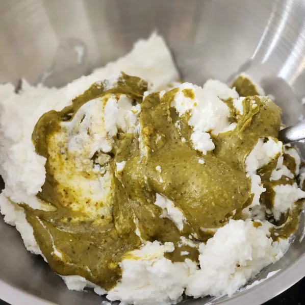 Trộn sữa chua, bơ hạt dẻ cười, mật ong và muối đến khi mịn