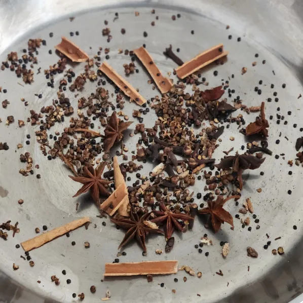 - Rang khô nguyên liệu: Cho tất cả gia vị vào chảo, rang nhỏ lửa 2–3 phút đến khi dậy mùi thơm.