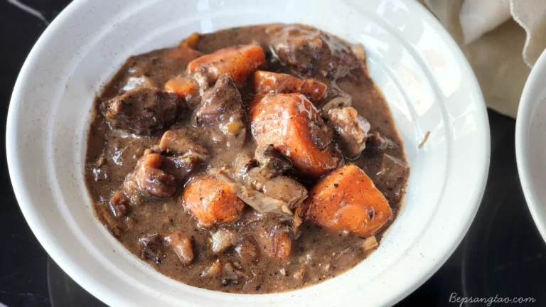 Bourguignon (đọc là “buốc-ghi-nhông”) là món hầm cổ điển của Pháp, thường được nấu với thịt bò, rượu vang đỏ và rau củ thơm. Món này ninh lâu, hương vị đậm đà, nước sốt sánh mịn — cực kỳ thích hợp cho những ngày se lạnh