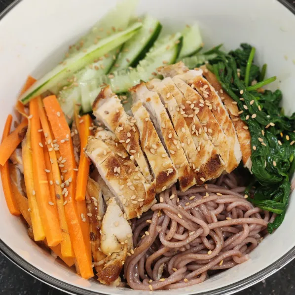Cho bún gạo lứt vào tô/đĩa, xếp gà và rau củ lên trên.