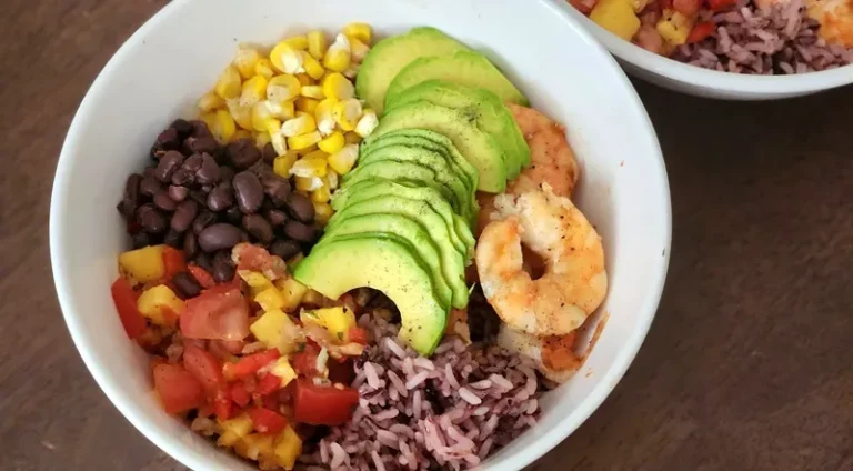 Món nourish bowl này kết hợp tôm nướng thơm ngon với sốt bơ chanh béo nhẹ, cùng nhiều loại rau củ tươi sống, đậu đen, gạo lứt và bắp vàng. Tô ăn này là sự hòa quyện của các nhóm thực phẩm thiết yếu, giúp cung cấp đủ đạm, chất xơ, vitamin và chất béo tốt cho cơ thể.