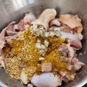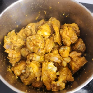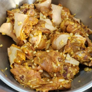 Trộn gà với 1 thìa bột cà ri, 1 thìa nước mắm, 1 thìa đường, tỏi và hành tím băm, để ít nhất 30 phút cho ngấm.