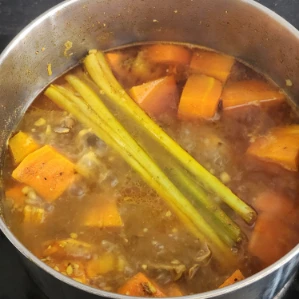 Cho cà rốt, khoai lang, khoai tây vào, tiếp tục nấu mềm.