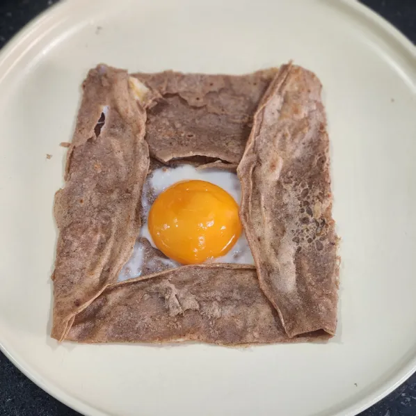 - Gập 4 mép bánh vào giữa (kiểu “hình vuông” galette truyền thống), chừa phần trứng hở ra ở giữa.