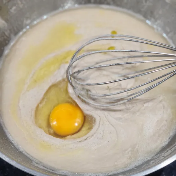 - Thêm 1 quả trứng gà, 1 muỗng canh dầu oliu vào bột và khuấy đều. Điều chỉnh thêm nước nếu bột đặc.