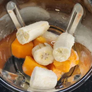 - Cho chuối, đu đủ, nước lọc, gừng và chanh vào máy xay.