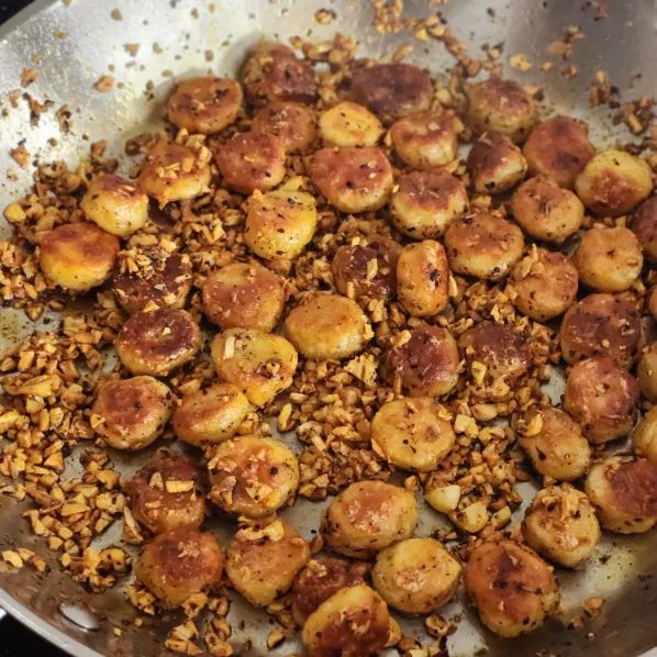 - Cho gnocchi vào chảo dầu tỏi, áp chảo lửa vừa đến khi vàng giòn 2 mặt.