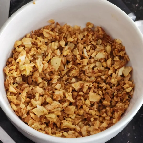 - Cho tỏi lát vào phi lửa nhỏ đến khi vàng giòn rồi vớt ra để riêng.
