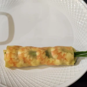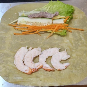 Cuốn nhẹ tay, đến gần cuối thì xếp 2–3 con tôm đã chẻ đôi cho đẹp mắt, rồi cuốn chặt lại.