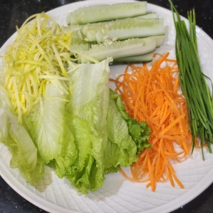 Xếp xà lách, rau thơm, ít bún, thịt ba chỉ, dưa leo, giá đỗ.
