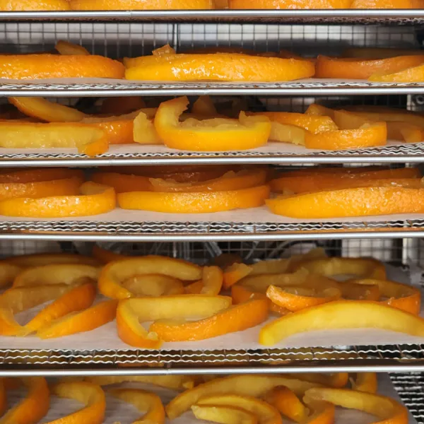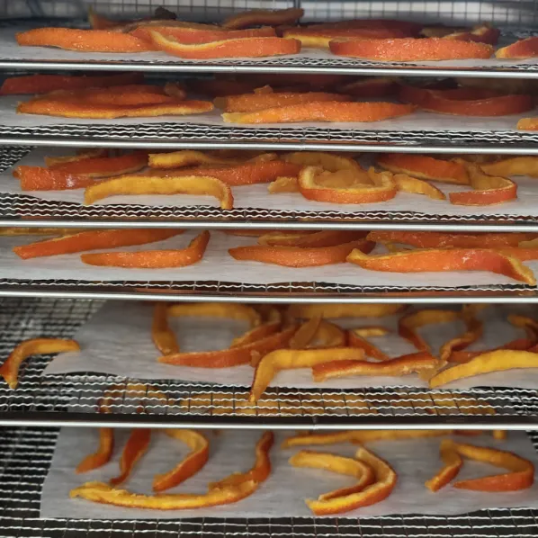 - Trải vỏ cam lên khay, sấy ở 50°C trong 6 giờ đến khi dẻo – khô mặt nhưng không cứng.