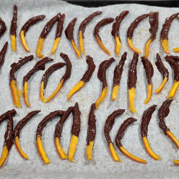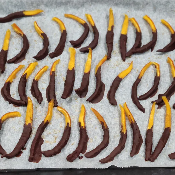 - Nhúng từng miếng vỏ cam dẻo đã sấy vào chocolate, để phần chocolate phủ 1/2 hoặc toàn bộ tùy thích.
