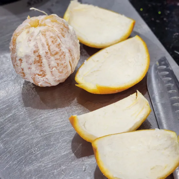 - Cắt cam thành 4 phần múi lớn, tách lấy vỏ – cách này giúp vỏ không bị rách.