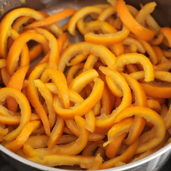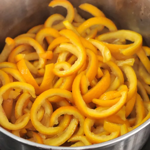 - Chần vỏ cam trong nước nóng 1–2 phút, sau đó thả ngay vào nước lạnh.