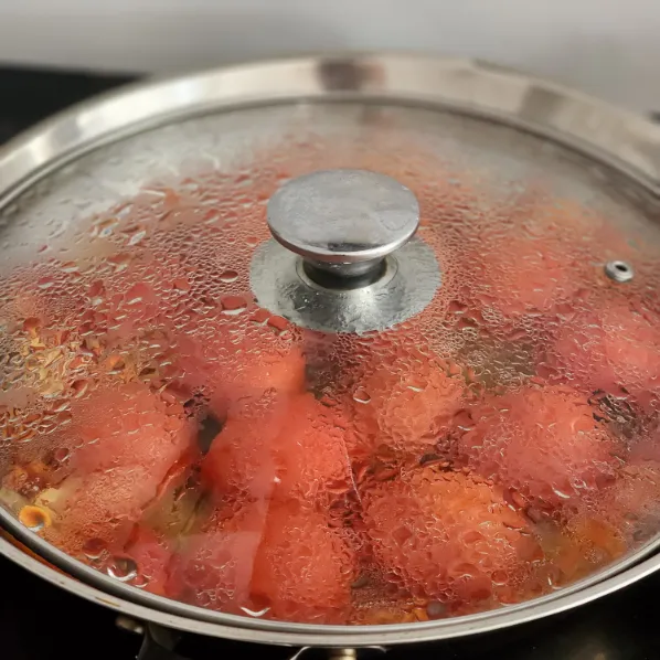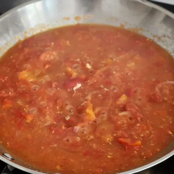 - Đun nhỏ lửa đến khi cà chua mềm, sệt lại và dậy mùi (khoảng 5–7 phút).