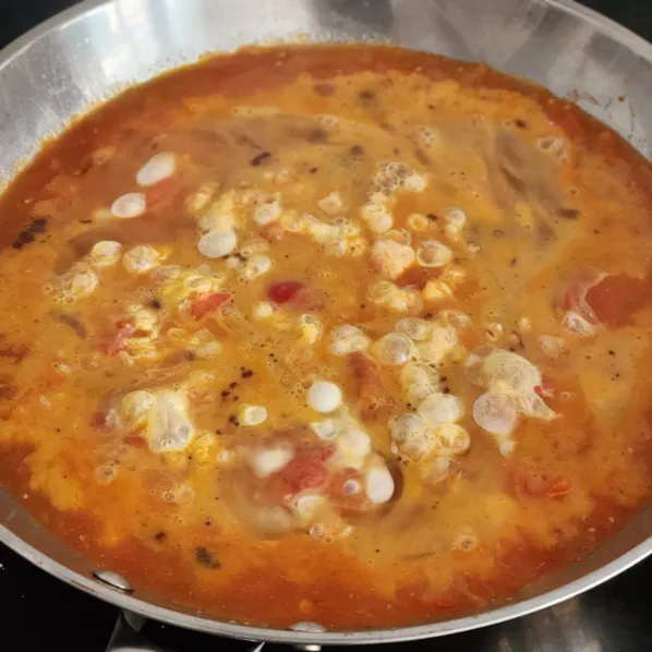 - Khuấy nhẹ để trứng hòa quyện với sốt cà chua, tạo kết cấu mềm mịn.