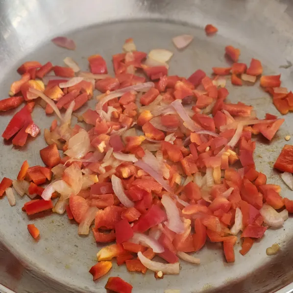 - Cho hành tây, tỏi vào xào đến khi vàng thơm, sau đó thêm ớt chuông vào đảo đều khoảng 2-3 phút.
