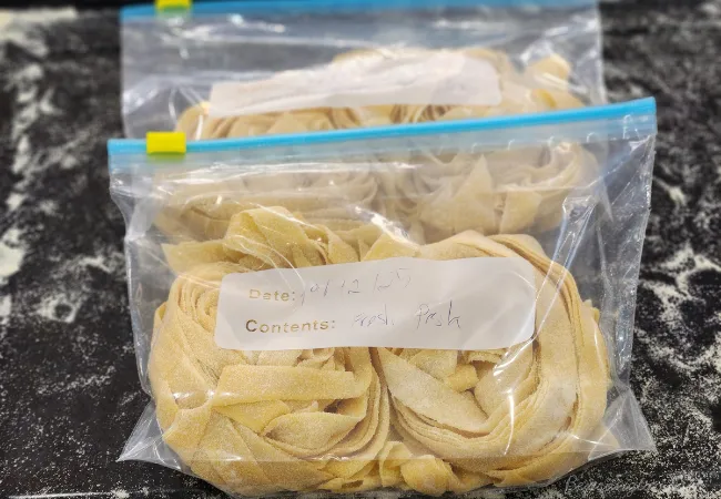 Rắc nhẹ bột áo lên sợi mì, chia thành từng phần, cho vào hộp kín hoặc túi zip. Bảo quản 2–3 ngày. Trước khi nấu, để mì về nhiệt độ phòng 5–10 phút.