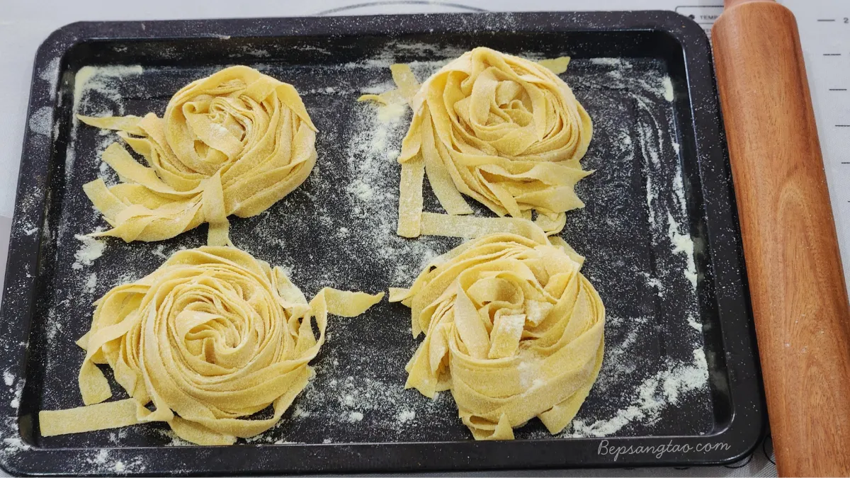- Rắc bột semolina để chống dính, không dùng bột mì trắng: semolina giúp sợi mì giữ độ khô và không dính lại khi luộc.