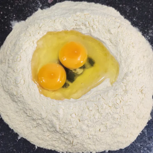 - Đập 2 trứng gà vào giữa, dùng nĩa khuấy nhẹ cho trứng tan dần và kéo bột từ ngoài vào trong.