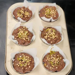 Đổ bột vào 6 khuôn, rắc thêm topping + 1 ít bơ hạt dẻ cười trên mặt.