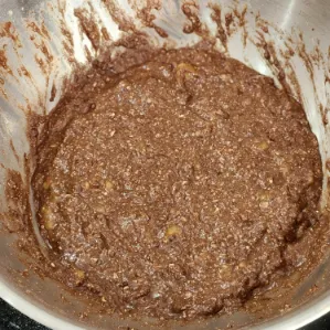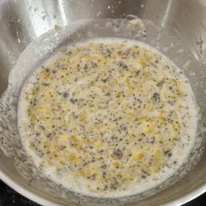 Ở tô khác: cho chuối nghiền, sữa hạt và gel hạt chia → khuấy đều.