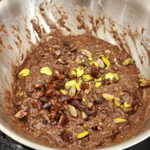 Thêm topping như hạt dẻ cười, chà là, cacao nibs → đảo nhẹ.