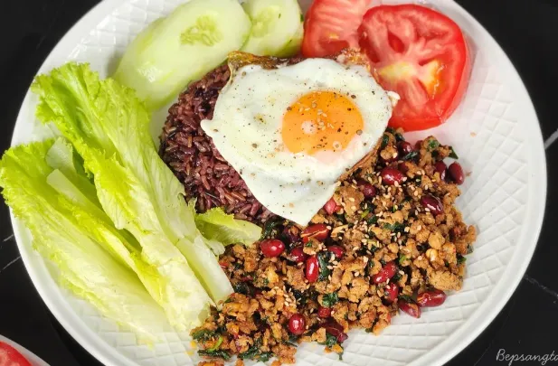 Trong phiên bản này, món ăn được cân bằng lại với cơm gạo lứt, nhiều rau củ và ít dầu hơn, nhưng vẫn giữ trọn hương vị cay nồng, mặn ngọt và thơm nức của nước mắm, tỏi ớt và lá húng quế tươi.