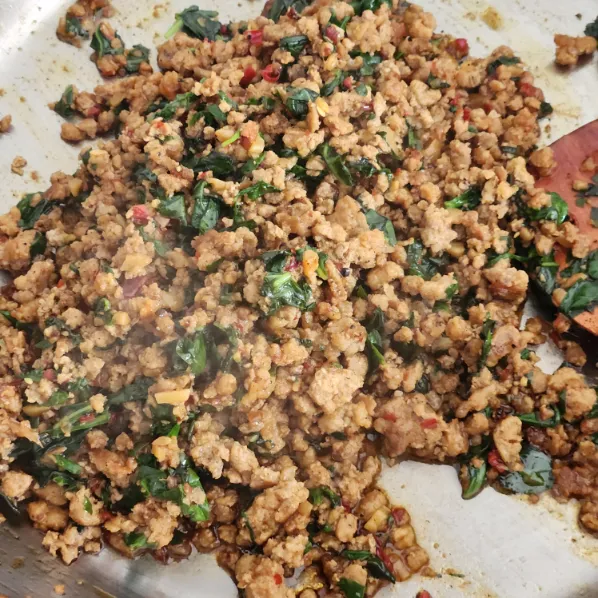Múc cơm gạo lứt ra dĩa, phủ hỗn hợp Pad Kra Pao lên trên.