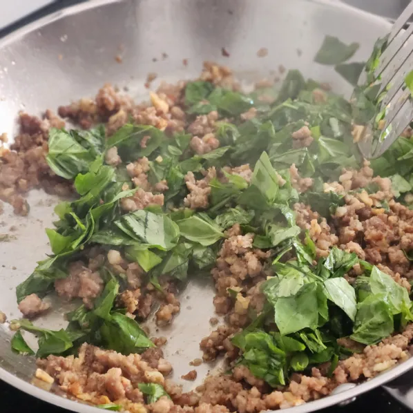 - Cho húng quế vào sau cùng để giữ trọn hương thơm. Lá húng quế Thái (holy basil) có vị the cay đặc trưng; nếu không có, dùng húng quế Việt hoặc húng quế Tây cũng ngon nhưng vị dịu hơn.