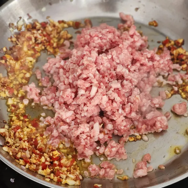 Cho thịt băm vào đảo đều ở lửa lớn để thịt tơi, không bị ra nước.