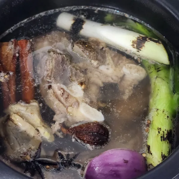 - Sau 30 phút, vớt thịt ra (dùng để ăn tái hoặc nạm); tiếp tục hầm xương ít nhất 2–3 tiếng.