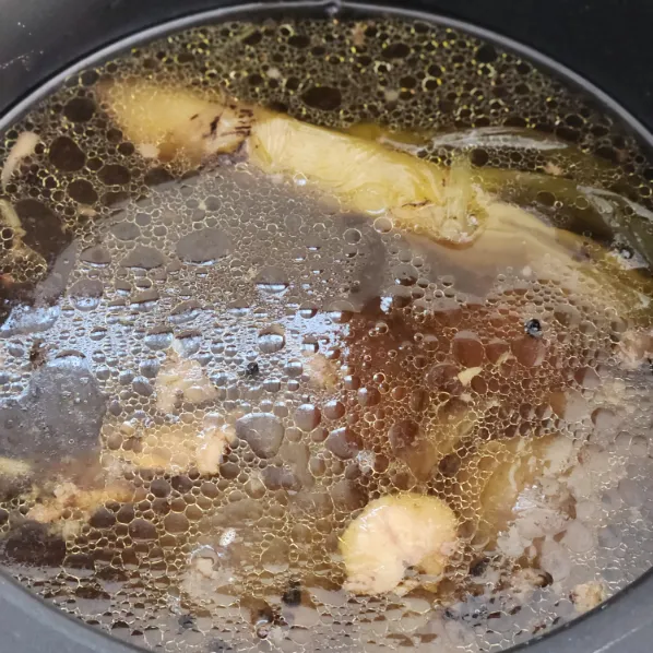 - Đun sôi rồi hạ nhỏ lửa, hớt bọt thường xuyên để nước trong.