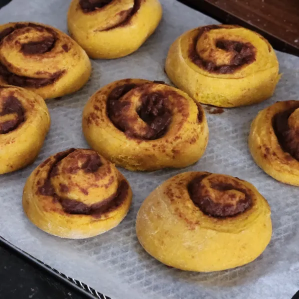 Những cuộn bánh bí đỏ thơm nức mùi quế, mềm ẩm tự nhiên nhờ men sourdough và vị ngọt thanh từ chà là – một phiên bản cinnamon roll lành mạnh, không đường tinh luyện nhưng vẫn ngọt ngào và đầy hương vị.