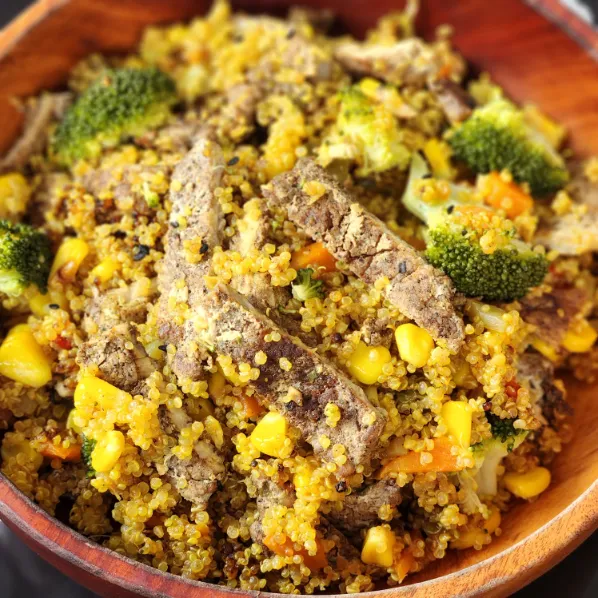 - Đủ chất, cân bằng: có protein từ gà, tinh bột tốt từ quinoa, chất xơ và vitamin từ rau củ.