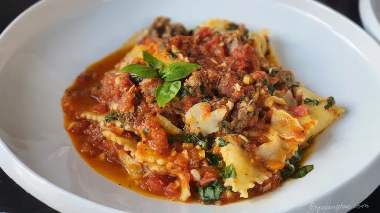 Ravioli là một trong những loại pasta nhồi nổi tiếng của ẩm thực Ý, với lớp vỏ mỏng bao lấy phần nhân mềm mịn bên trong. Khi kết hợp cùng sốt cà chua nấu chậm, món ăn trở nên cân bằng: chua ngọt tự nhiên, thơm mùi thảo mộc, nhẹ nhàng nhưng vẫn đủ đầy dinh dưỡng. Đây là lựa chọn lý tưởng cho bữa tối ấm cúng hoặc một bữa ăn mang tinh thần Mediterranean tại nhà.