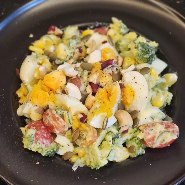 Một món salad đầy màu sắc, dễ làm và giàu dinh dưỡng từ bông cải xanh, trứng luộc, bắp Mỹ ngọt, cà chua bi, và dưa leo tươi giòn. Khi kết hợp cùng sốt sữa chua béo nhẹ hoặc sốt dầu giấm chua dịu, đây là bữa tối hoàn hảo: thanh nhẹ, tiện lợi nhưng vẫn đủ chất.
