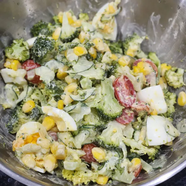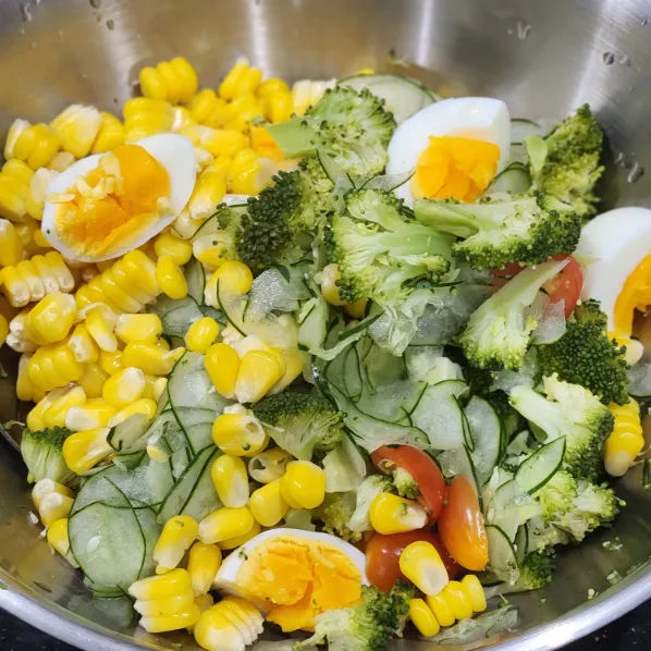 Cho tất cả vào tô lớn: bông cải, bắp, trứng cắt đôi, cà chua, dưa leo.