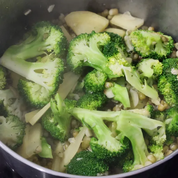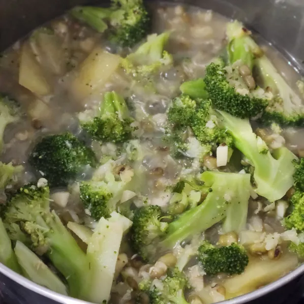 Thêm bông cải xanh, tiếp tục nấu thêm 5–7 phút.