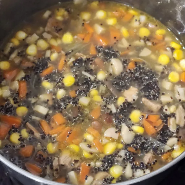 Khi nước sôi, hạ nhỏ lửa, đậy nắp và nấu 20 – 30 phút cho tất cả nguyên liệu chín mềm, quinoa nở tơi và nước hơi sánh lại.
