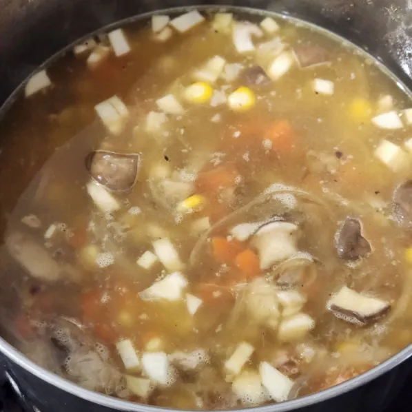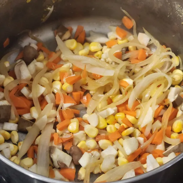 Cho cà rốt, khoai lang, bắp, bí và cà chua vào đảo đều. Nêm ít muối và tiêu cho rau thấm vị.