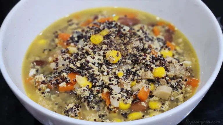 - Giàu dinh dưỡng: quinoa và đậu cung cấp protein thực vật, kết hợp nước hầm gà và rau củ giúp cân bằng dưỡng chất.