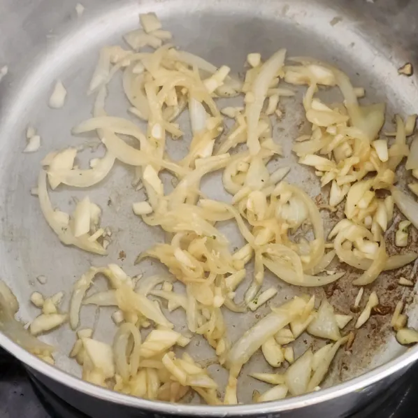 Làm nóng chút dầu hoặc nước trong nồi, cho tỏi và hành tây vào xào thơm đến khi hơi vàng.