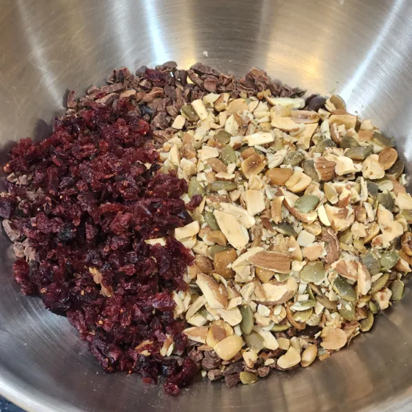 Thêm nam việt quất khô, trộn đều cho đến khi các nguyên liệu quyện lại.