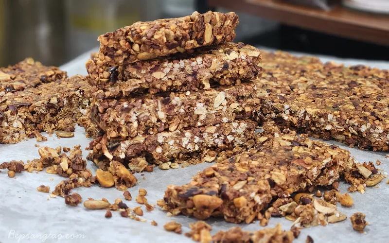 Nếu bạn thích món ăn vặt lành mạnh, ngọt dịu tự nhiên và giàu năng lượng, thì thanh ngũ cốc granola là lựa chọn tuyệt vời. Với nền là kiều mạch rang giòn, kết hợp cùng yến mạch, các loại hạt, chà là và nam việt quất khô, thanh granola này vừa bổ dưỡng, dễ mang theo, vừa giúp no lâu – hoàn hảo cho bữa sáng nhanh hoặc bữa xế healthy.