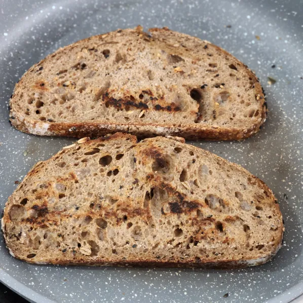 - Nướng bánh mì: Nướng bánh mì trong chảo khô hoặc lò nướng cho giòn nhẹ vàng đều hai mặt.